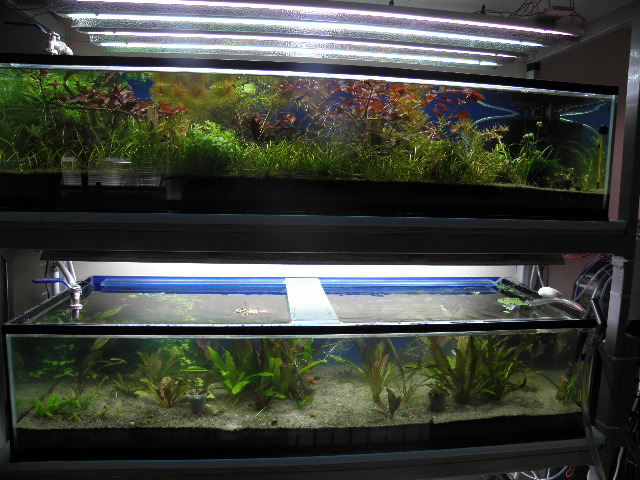 В который раз я убедился в силе тени против вьетнамки и бороды:в аквариуме несколько недель назад активно росли водоросли(собственно не заростал весь аквас но они неуходили и почуть чуть увиличивалось их количество,которое я уменьшал выбрасыванием пораженных растений или их отдельных листиков),решил поставить лампы таким образом чтобы свет равномерно попадал во все углы аквариума,и всвязи с этим убрал 2 экономки по 20 Вт 4200К,в итоге получилось на 140л 6 ламп по 18Вт каждая (ЛЛ Филлипс 765).Процесс переделывания креплений для ламп в крышке занял 2 дня(проводов море,так как стоят дросселя)тоисть аквариум существовал 2 суток без освещения.Фотосинтез улучшился,а водоросли постепенно уходят,на данный момент их почти неосталось.Пошел в рост стаурогин,эхинодорус нежный и хемиантус.Смена правда неподуше только перистолиснику рорайма и лимнофиле(это я постараюсь исправить 830-840 лампами).Позже отпишусь шо с этого получилось