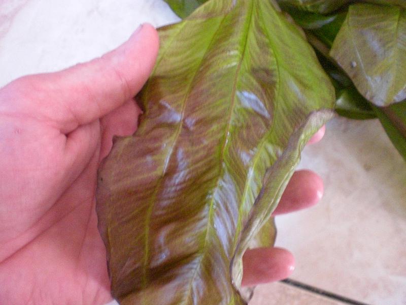 Интенсивная жёлто-зелёно- красная окраска листа , эллиптически вытянутого, кругло заострённого к вершине достигается сильным освещением и внесением питательных добавок в грунт.