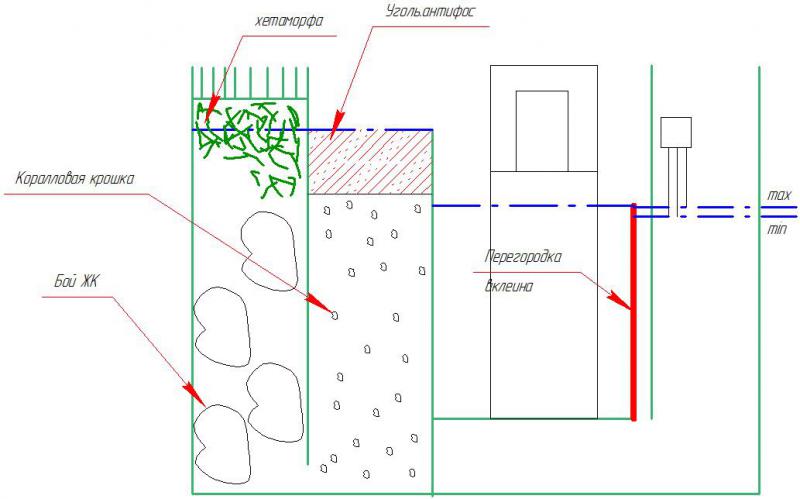Перегородка вытаскивается,да.,но только для изменения уровня воды.А вода поступает через гребенку в первый отсек и выходит через помпу на последнем отсеке.Если помпу возврата отключить вода переливаться через гребенку не будет и вода не будет циркулировать.За герметичность отвечает разве что сама задняя стенка сампа,та которая синяя из пластика. Если думаешь делать море такого обьема,то лучше не марочиuть голову и купить типа такого ресана или boyu. штука-полторы не сделает погоды для моря  а головняка меньше будет.Я тоже хотел на всем сьэкономить,но теперь понимаю что аквариум сам по себе ничего не стоит