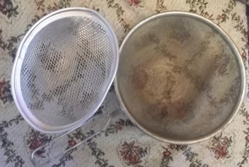 Ставлю 20 литровый пластиковый ящик в ванну . С помощью друшляка из сетки /см.фото/ и холодной воды из крана , отделяю попавшую грязь - листики , веточки , личинки стрекоз , головастики и т.п. Далее на фото в пост 20 на фото 4 три сачка "ПЫЛЕВОЙ" , "ПОСЛЕ ПЫЛИ" , " ДАФНИЯ " , я использую как сита . Сачки с разной ячейкой я использую еще для удобства ловли . Если мне нужна пыль я ставлю - пылевой , если циклоп - после пыли , дафнию я ловлю с соответствующей ячейкой . Ткань для сачка можно купить в спецмагазинах в крупных городах "СИТОТКАНЬ" , эта ткань применяется для сит на мельницах и имеет ячейку от сотых долей миллиметра , до миллиметра . Можно пользоваться тканью из капрона для гардин купленной на секонде и т.п.