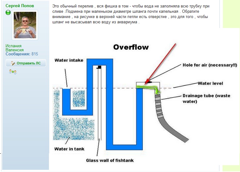 "Заразили" вы меня этой петлей . Сегодня полдня "упирался" , эксперементировал ... Применял разные трубочки от 4мм до 10мм . Нифига не получалось - под током воды вылетали все "воздушные пузыри" из сгиба трубочки . Пришлось вопросы задавать... Мне ответили вразумительно : " Это обычный перелив , вся фишка в том - чтобы вода не заполняла всю трубку при сливе . Подмена при маленьком диаметре шланга почти капельная . Обратите внимание , на рисунке в верхней части петли есть отверстие , это для того , чтобы шланг не высасывал всю воду из аквариума . " А отверстие в верхней части сгиба трубочки , для подсоса воздуха я не делал ... P.S. Для лучшего понимания системы наберите в поисковике "overflow aquarium diy ", и посмотрите в картинках всевозможные варианты решений связанных с переливом .