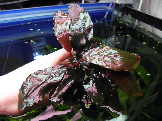 У Bucephalandra sp. Super Blue, Central Kalimantan,о которой эта тема,молодой лист имеет красноватый оттенок и цветок розового цвета.