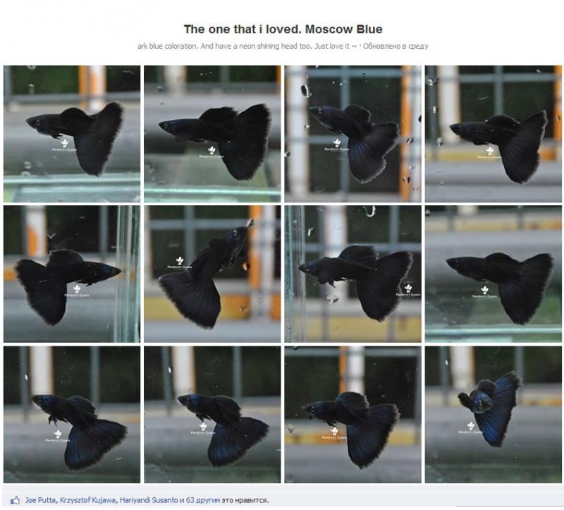 Несколько субъективных слов о породах " Черный принц " и "Черный монах ". Эти породы гетерозиготны , другими словами - расщепляются и их нужно постоянно "собирать " . На фото 1 цитаты В.В.Сторожева . Причем черный монах - фактически не черный , он настолько темно-синий , что можно сказать "почти черный" см фото 2 . Фото 2 я взял у Pandora's Guppy , см. фото 3 /лэйб вверху/. Недавно появилась информация от Nomigi Chizuma , фото 3 /лэйб внизу/ , На фото 4 - показана рыба нового штамма /породы, линии / "Сплошной Черный" . Nomigi Chizuma , пишет - Полный черный в этом штамме гуппи, является реальной СПЛОШНОЙ ОКРАСКОЙ для этого штамма . Не сравнить с оттенками в Москве /Черный монах/ , меняющими свой цвет на сине-черный .