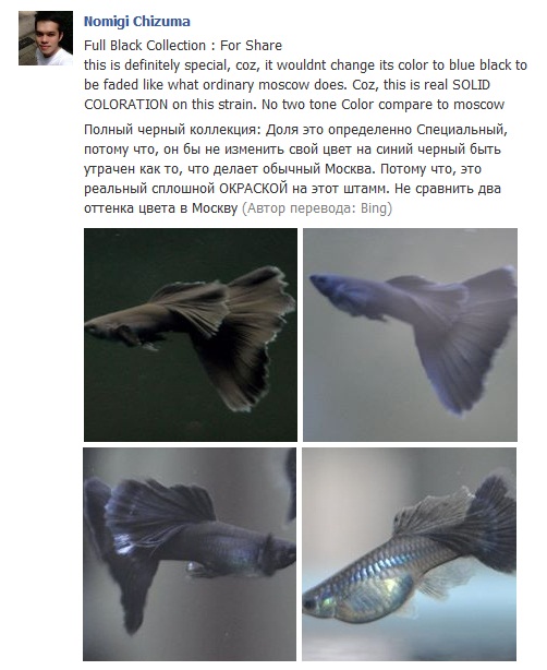 Несколько субъективных слов о породах " Черный принц " и "Черный монах ". Эти породы гетерозиготны , другими словами - расщепляются и их нужно постоянно "собирать " . На фото 1 цитаты В.В.Сторожева . Причем черный монах - фактически не черный , он настолько темно-синий , что можно сказать "почти черный" см фото 2 . Фото 2 я взял у Pandora's Guppy , см. фото 3 /лэйб вверху/. Недавно появилась информация от Nomigi Chizuma , фото 3 /лэйб внизу/ , На фото 4 - показана рыба нового штамма /породы, линии / "Сплошной Черный" . Nomigi Chizuma , пишет - Полный черный в этом штамме гуппи, является реальной СПЛОШНОЙ ОКРАСКОЙ для этого штамма . Не сравнить с оттенками в Москве /Черный монах/ , меняющими свой цвет на сине-черный .