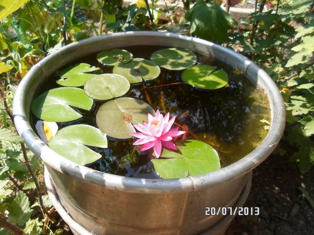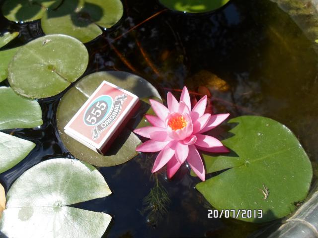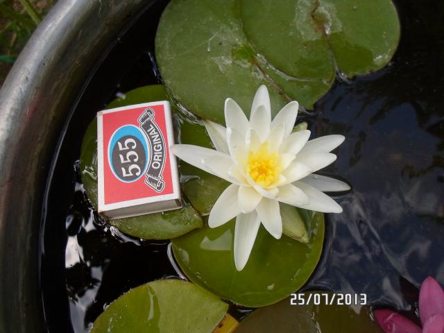 Да было бы чем гордиться... Их я купила в мае как 'Celebration' и 'Perry's Double White', поэтому и прицепила спичечный коробок во время цветения для соразмерности. Прислали таких два огрызочка, что удивительно, что они вообще зацвели (да и вообще выжили). Хоть бы листьев наростили. Емкость - бак от стиральной машинки, зимовать переставлю в холодную теплицу к цветам, пруда нет, но есть два больших бака для воды. Если можно добавить ссылку, то вот этот сайт http://www.gardenpond.com.ua/ , там есть прайсы. Жаль, что на сайте не предусмотрены отзывы (видимо специально и не предусмотрели  )