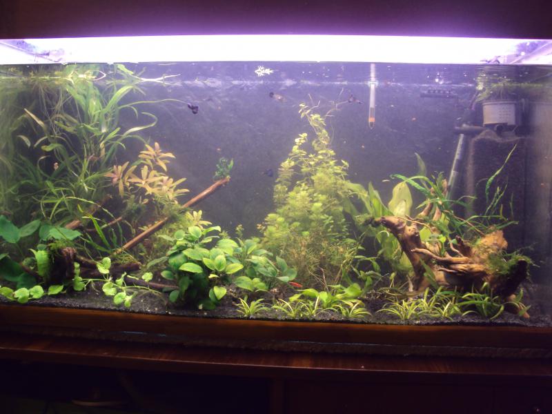 Запуск две недели назад С засаживанием растений... честно говоря помогал один очень добрый форумчанин. Ему отдельное большое спасибо!!! Литраж 200л. свет 4лампы Т8 30w Со2 и удо пока не подаются. Планирую запустить туда харацинок, но пока в раздумьях. Может кто то покритикует по свету, растениям и т д.