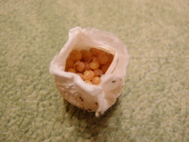 Отобрал кокон на 26-й день. При вскрытии обнаружилось что часть яиц в коконе испортились и почернели, вокруг