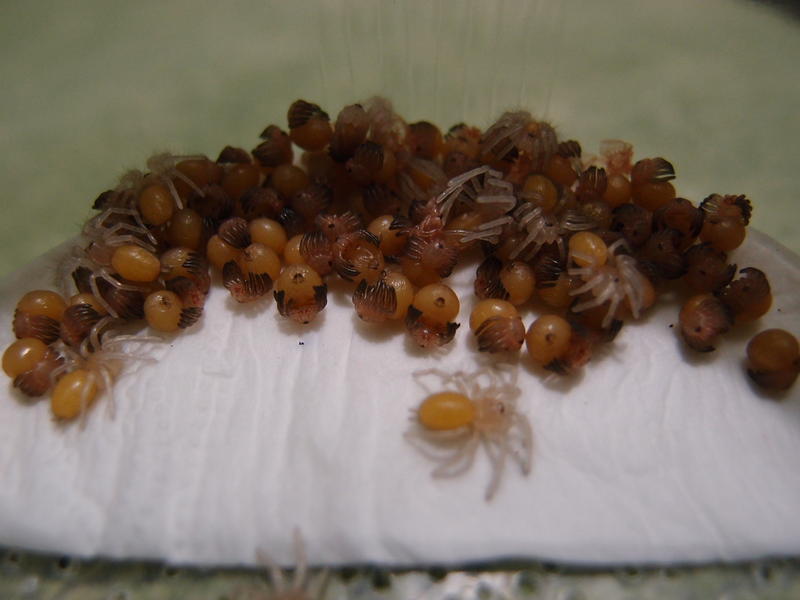 Первая попытка получить потомство от этого вида была осенью 2011-го года. На тот момент у меня была субадультная самка и адультный самец, под которого приобрел взрослую самку. Хотел дождаться линьки самки перед спариванием, но она отложила кокон. Скорей всего неоплод, тк он очень скоропостижно загнил, что было замечено поздно - он уже кишил клещами и горбаткой. К сожалению, самка продолжала держать испорченный кокон в хелицерах, и похоже паразиты проникли внутрь - после отнятия кокона самка скоропостижно скончалась с признаками ДС.