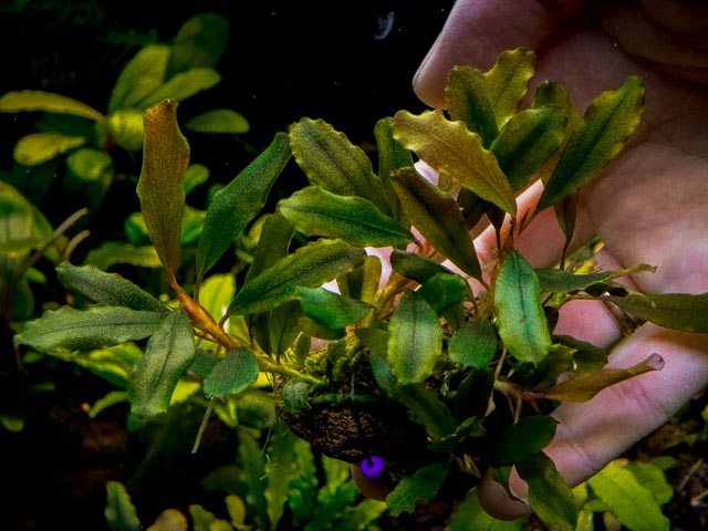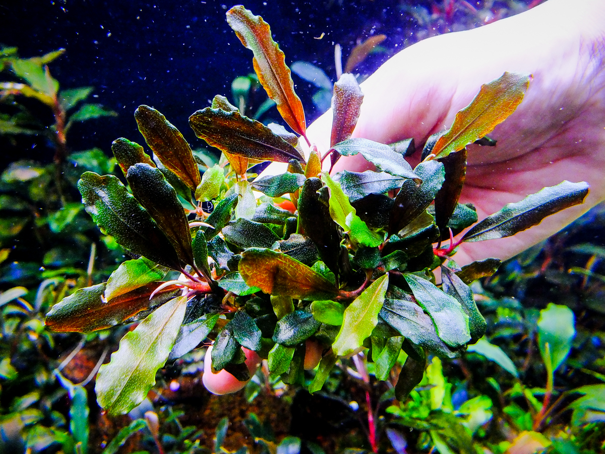 Примечательна тем, что ее листки глянцевые, наверное жители аквариума видят в ней свое отображение, ни у одной у меня имеющихся буц такого глянца не видел...