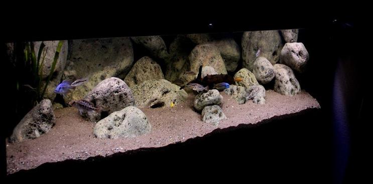 Аквариумист в своем аквариуме должен максимально создать условия близкие к природным. Малави это мбуна и утака. Мбуна обитает в скальных участках озера и питается в основном обрастаниями с камней. Утака обитает больше в промежуточной и песчаной зоне озера. Смешивать эти виды как по питанию, так и по обитанию не желательно, но можно создать и в Вашем аквариуме условия для этих рыб. Для мбуны соорудить скалы из камней и оставить часть песчаной зоны для группы утака. Примерно так на фото, но есть еще масса вариантов в ссылке, где малави разберетесь.