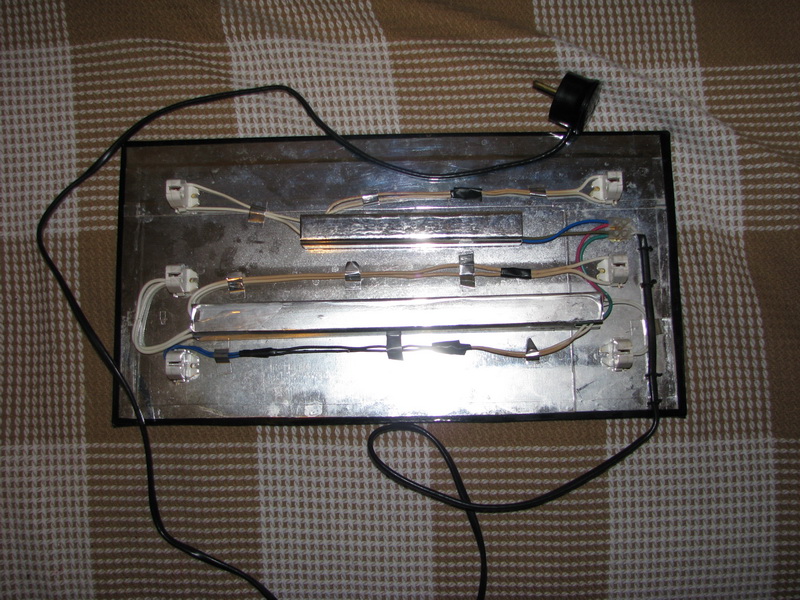 Стояла на аквариуме, который изначально был с покровным стеклом и имел пространство для держателя с лампочкой накаливания 15 Вт (крепился на задней стенке), т.е. покровное стекло располагалось на распорках примерно в 7 см над максимальным уровнем воды (иными словами, в этом аквариуме передняя и боковые стенки на 6-7 см выше, чем задняя, поэтому максимально воду можно залить по заднюю стенку, а передняя и боковые выше настолько, чтобы между светильником или покровным стеклом было достаточно места). Такие аквариумы продают на киевской "птичке" (самодел).
