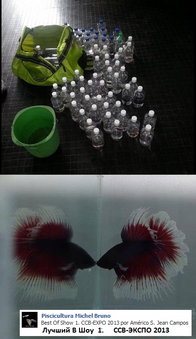 Остался еще один день выставок в Берлине и Бразилии . Окончательные результаты будут ясны вечером . Фотографии победителей и учасников , появятся позже - их будут выкладывать в инете учасники выставок . На фото 1 - призы ожидающие своих номинантов в Берлине - 2013 , и соответственно на фото 2 призы в Бразилии . На фото 3 и 4 , гуппи эндлера выставляемых Stefan Karl Hetz , и отзыв Луки Roebuck - фото 5 . В Бразилии в субботу проходил конкурс бетта/петушков/ . Я знл , что петушков перевозят в пластиковых стаканчиках , но интересное фото 6 , петушков перевозят в стеклянных пузырьках и их вмещается в небольшой сумке значительное количество . На фото 7,8,9,10 рабочие моменты подготовки стенда для выставляющейся рыбы .