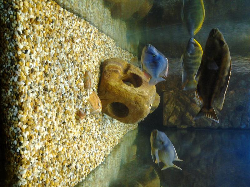 Привет.Может далеко не самый красивый аквариум---но зато рыбам хорошо расти вот до таких размеров  На фото только самцы.Есть редкие виды как для аквариума.пусть все до конца вырастут,окрасятся--потом куплю им самок и украшу декором акву поболее.На фото:--Tyrannochromis Maculiceps -- Altolamprologus calvus---Aristochromis christyi---Dimidiochromis--- Nimbochromis venustus--- Champsochromis caeruleus.