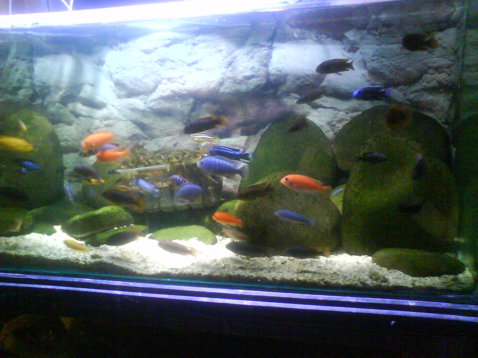 Вообщем 350(135*50*50)литровый аквариум , рыбы восновном представители Мбуны, зебры 2вида, Псевдотрофеусы Пиндани, белый принц, Демасони, Солуози, Меланохромисы Йохани, золотой Йохани, Чипока, Ауратус, Йодики, из Утаки Джексоны, васельки, еще всякого разного, всего штук 45