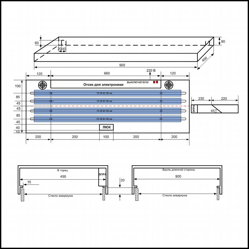 установлена электроника для четырёх ламп Т5 типа по 39 Вт мощности каждая;