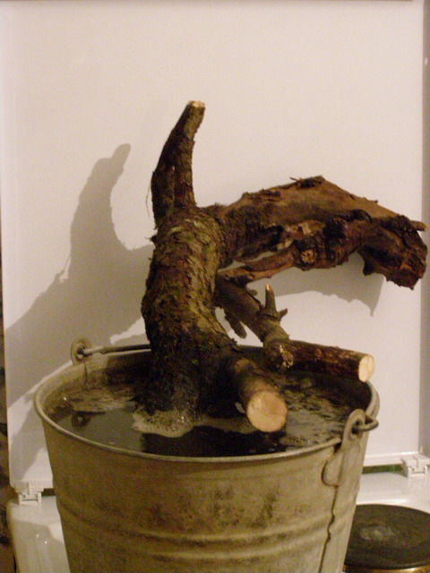 однако мне повезло. первым был найден (спасибо анюте!) срез дерева, пустого внутри с бывшим дуплом дятла (предположительно). он порядком сгнил (особенно внутри, но не настолько, чтобы не взять с собой). нашел я его в парковой зоне. затем последовали мучительные поиски чего-то типа коряги и, когда я уже почти отчаялся найти таковую, случайно заметил неплохой изгиб веток прибрежного куста (таких там много) и полез его рубить.