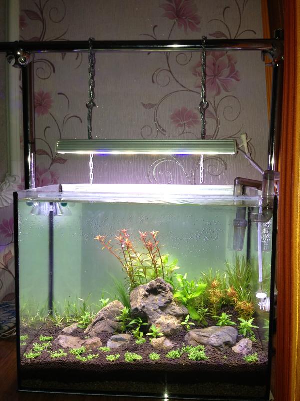 Каждый день подмениваю 50% воды на осмос+реминирализатор. Добавляю калий. Свет 7 ч, СО2 7ч 1п/с. после выключения устанавливаю сопло вентури на выходной патрубок фильра для аэрации. Растения уже повыпускали новые корешки, куба тронулась в рост, хотя немного смотрит вверх, вроде света достаточно, если что можно будет добавить.