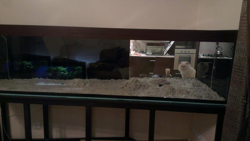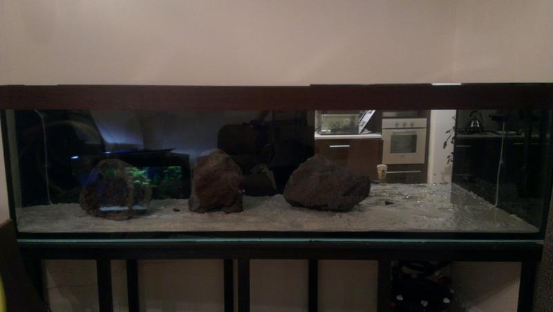 Вчера вечером уложили грунт (кварцевый песок), залили 40% воды, подключили один внешний фильтр и компрессор
