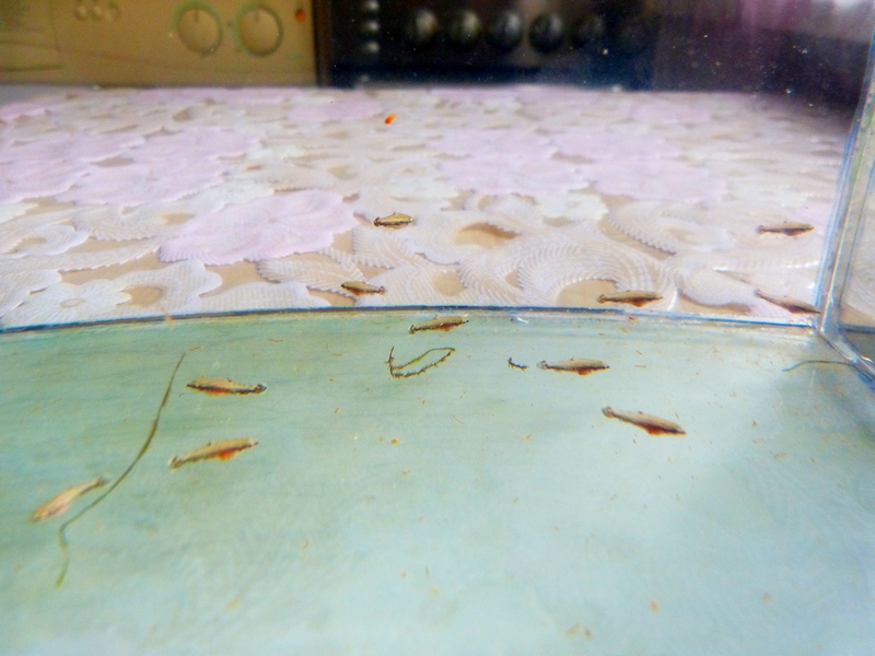 7 января отнерестилась пара нанностомусов мортенталера. Всего было 21 икринка,из которых через 3 дня выклюнулись 17 личинок. Все они еще через 4 дня поплыли и получили корм-инфузорию.Через месяц мальки подросли и,казалось что проблем уже не будет, стали часто дышать и отказались от корма. Я не стал экспериментировать с лечением и добавил в аквариум половинную дозу медного купороса. К счастью рыбки оказались стойкими к купоросу,но 5 мальков я все же потерял. Теперь рыбкам более 3 месяцев,живут в общем аквариуме и педают практически все виды корма,которые помещаются в ротик,хотя хорошими едоками назвать их не могу.Растут потихоньку..... На двух фотках производители.Прошу прощения за качество-не специалист.