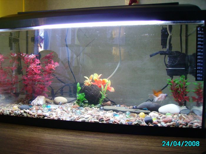 Это первый день запуска..всё что там стоит будет убранно позже(через какой месяц).Просто поставила на время пока не определилась что и как.Из того что есть оставлю только грунт и спец.оборудование.Живые растения?Боюсь!тут голова от рыбок болит, а ещё и за растениями следить...