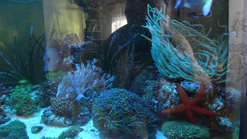 Сейчас аквариум выглядит так, очень мне уже хочется предпринять какие то радикальные меры, типа CHEMICLEAN,но пока животные чувствуют себя удовлетворительно-все живы,распускаются и даже растут, надеюсь на время- по тестам- немного завышены фосфаты и нитраты PO4-0.1,NO3-2.5,NO2-0,3,KH-6.7,PH-8 Краб оказался таким трудягой, перекапывает песок конкретно, уже вырос и очень доволен своим огромным домом...