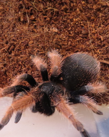 А вот мой первый паук птицеед - самочка Brachypelma Smithi, ориентировочно L7-8. После не самой удачной доставки (промёрзла и просто выпала без признаков жизни из ёмкости) оклемалась и радует меня своей красотой