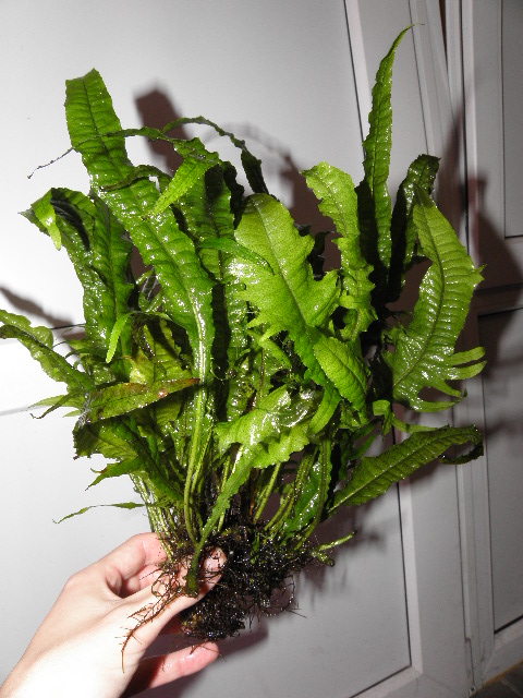 Microsorum pteropus "Tropica"- кусок маточного куста, это уже максимальный размер в высоту, листики в среднем 25 см, самые длинные 30 см- больше не растет. Потрясающе декоративный, самые- самые теплые слова. "Тропика" -спасибо за него. Кто выиграет, получит несказанное удовольствие от созерцания и осязания этого куста. Готовая декорация. Делаем ставки. Он того стоит. Вырастить такой куст надо не мало времени, но это вы и сами знаете. Так что вперед- да будет аукцион!
