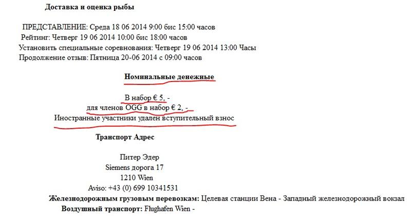 Вот здесь - http://www.oegg.net/Ausschreibungen/2014_Auss_Deu.pdf . О оплате сказано только это/перевод ГУГЛА/ - см. фото , как я понимаю рыбу иностранцам можно пересылать и самому на выставке не присутствовать . Платится переводом по банку 5Е . После выставки рыбу обратно никто высылать не будет - возможен только возврат 5Е . если рыба будет проданр с аукциона . И еще в том случае , если рыба получит не менее 75 баллов . Так как "шаровики" , выставляющие дешевый деребас ниже 75 баллов классом , стоящие копейки - будут требовать 5Е .