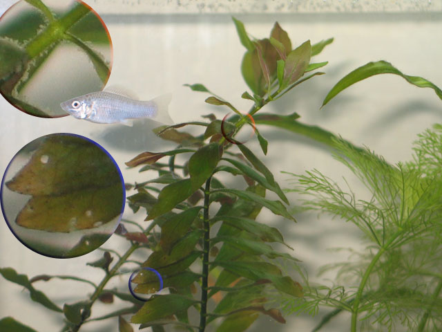 На листьях появились дырочки и кончики слегка пожелтели (на втором фото синие кружочки). Дырочки появились и на криптокорине(?) (первое фото).