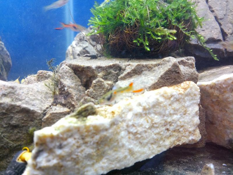 ... Эндлеры подросли и дали первый "урожай". Причём Эритрозонусы обитают в нижнем слое воды, а мальки немного освоились и плавают с взрослыми Эндлерами вверху. Боялась, что съедят их, но нет все на разных "этажах" и никто ни кого не трогает. Ну и заросли на всяк случай из Гидрокатилы...