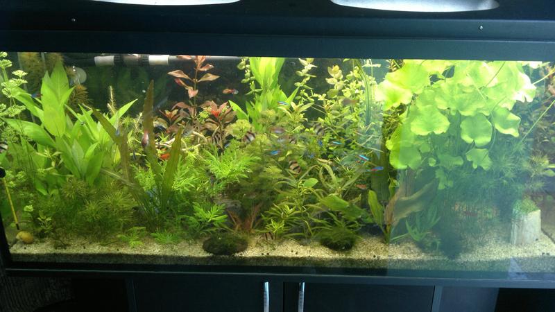 Созвонились, попросил совета по запуску и его УДО. Проблема состояла в том, что аквариум стоял в летнем домике и запуск был всего на месяц - потом аквариум нужно будет опорожнять и перевозить. Ну думаю как раз наберусь опыта за месяц) Заказал всяких растений, УДО у DEPSa, выкинул свой морской венигрет с пляжа( хочу заметить что вода у нас достаточная жесткая, артезианская pH-8, GH 13-14, KH 10-11) Купил кварцит 3-5мм, переделал крышку сделав примерно 1Вт/л, СО2, внешник RESUN и ЗАПУСТИЛСЯ) Причём в силу отсутствия терпения запускался быстро. На второй день были посажены растения, на третий день уже заселен барбусами, неонами и маленькими сомиками))) Само собой темпы роста у меня были далеки от того как перла растючка у Прохора, но я всё равно не мог нарадоваться своим аквасом. Долго не мог поймать соотношение нитрат фосфат. Нитрат был 10-15, а фосфата едва доходило до 0,5 и пока я не залил правильную дозу РО4 макро не лил, только микро чередуя с хеллатом Fе. К сожалению сам запуск я не додумался сфоткать. но гдето через дня три сделал несколько снимков