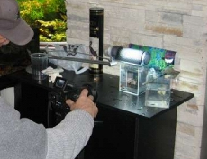 Ниже на фото В.В.Сторожев на выставке "Гуппи - Осень 2007" , фотографирует выставочных гуппи , а здесь результаты этой фотосессии http://guppyclub.mkat.su/plugins/med.../browse.php?33 . Несколько советов от В.В.Сторожева : Фотографировать нужно без применения вспышки . Ёмкость для съёмки шириной 1.5-2см . Выдержка как можно меньше . От себя добавлю , я использую портативный маленький штатив , который можно установить прямо на столе перед аквариумом /см. на фото2/ . Иногда фотографии делаю на балконе при естественном освещении , но не на прямом солнечном свету . .
