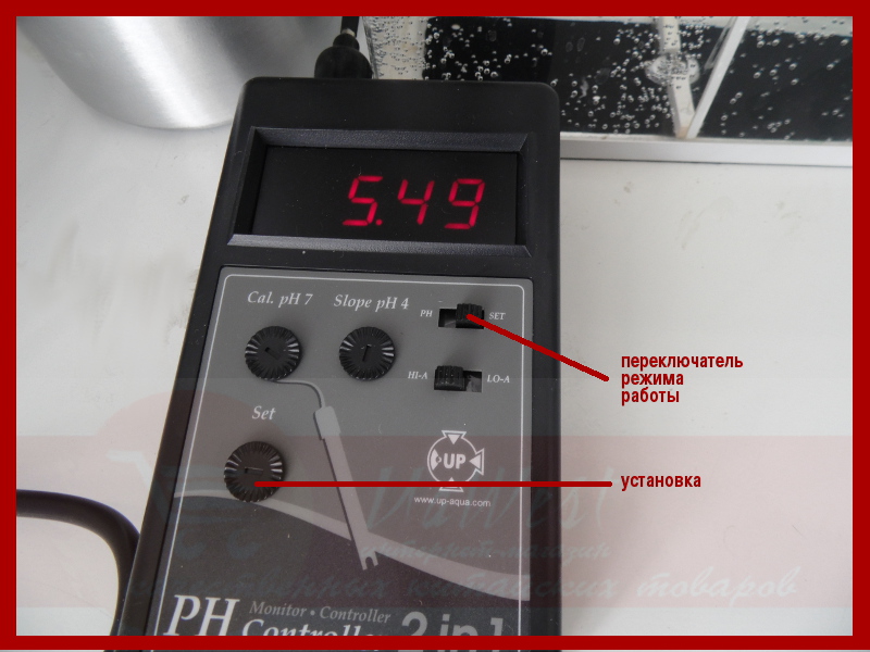 И последнее - для работы прибора нужно переключить его в режим “РН” и выбрать, какое действие нам нужно - понижать рН или повышать. Т.к., мы имеем более высокое значение рН, чем нам нужно, то и устанавливаем переключатель в режим “HI”: