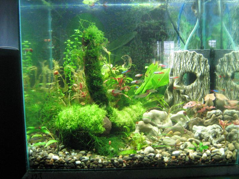 22.05.08 во второй половине дня, чего-то мне захотелось предпринять в отношении к банке, что долгое время квасилась в стерильном состоянии стоя на сейфе, служила в качестве карантинника. И вот, надоело созерцать мёртвую тишину, банку слил, промыл, прожег совдеповской увч лампой, так, долгострой мне был не нужен, банка 48 литров, почти кубик, слил по ведру, около 30 литров с рабочих банок, ведро из-под крана, с водой готовчик, кулёк с грунтом и всякими цацками уже давно пылился на складе, содержимое было промыто и ошпарено кипятком, уложено в предполагаемый шедевр    , растения, в торговых банках надыбал всякого мусора, не имеющего товарного вида, кокос и огрызок коряги спёр из банки с анцитрусами, на новую грелку и фильтр не поскупился, и вот в течение часа початок жизни типа травника был сделан. Из жильцов было отдано предпочтение килли, но они, через час были выселены, а их место заняли: 8-ред черри, 2-апистограммы борелли, 5-золотых неонов, 6-обыкновенных, 7-родостомусов, 2-малька стурисомы панамской, 2-ампулярии (на момент написания, все живы и здоровы аппетит в норме  ), и вот, банка готова, да, свет пока 2х11Вт дневной. Самое смешное, произошло, когда начал фотографировать, даже застеснялся показывать фотки  , но, будем надеяться, что со временем аквариум перерастёт этот казус