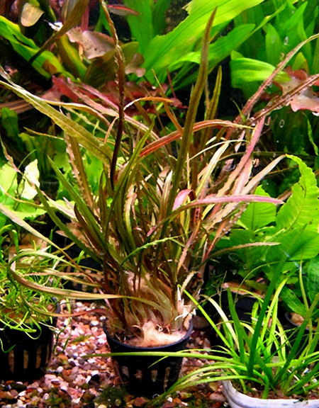 1) Красное/коричневое кустовое с длинными листочками (не лопухами). Будет на освещенном участке, медленное течение.
