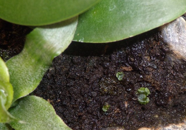 Я засыпал торфяной грунт двух-трех видов ,плюс намешано к нему в террариум всяких сфагнумов сушеных и коры , из разных видов грунтов для орхидей .На этой каше сначала образовалась пленка из сине-зеленый и бурых водорослей .По мере её эволюции на поверхности грунта проросли споры мхов и как мне кажется лишайник . Вот фото мхов двух разновидностей и какие-то зеленые пластинки, которые я и принял за лишайник.