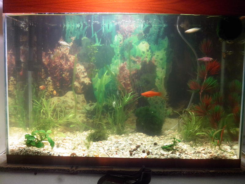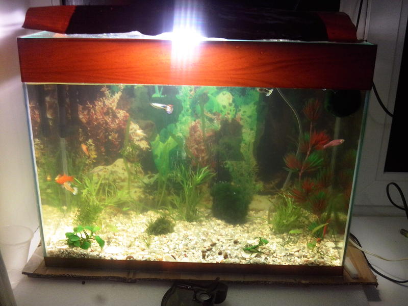 Сам аквариум был тщательно выдраен от зеленых и черных наростов на стекле. Грунт был промыл в проточной воде потом прокипятил минут 20. Растения также были местные, промыл в проточной воде, перебрал, большую часть пришлось выкинуть, оставил те что были более чистые (как потом вычитал понимаю что в аквасе была (да и наверно осталась) черная борода и/или что то их этих вредных водорослей). Воды отстоянной понятно что не было, брал с бювета. Пришлось старую отфильтровать немного (пропустил через несколько слоев сентипона) и где-то 60 на 40% (старя / новая) залил в аквас. Воду подогревал на газу и разбавлял. Света одна экономка 4100К на 20Вт.
