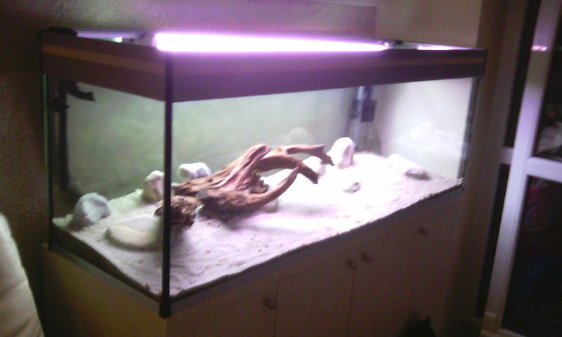 Уложил слой крупного песка белого, камни и вот такую композицию из нескольких мангровых коряг.