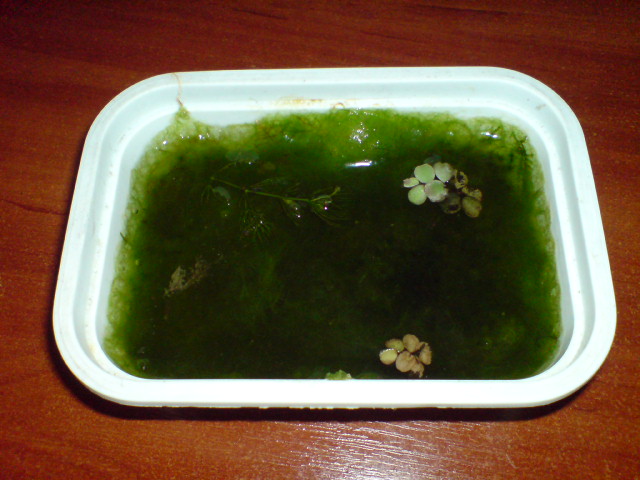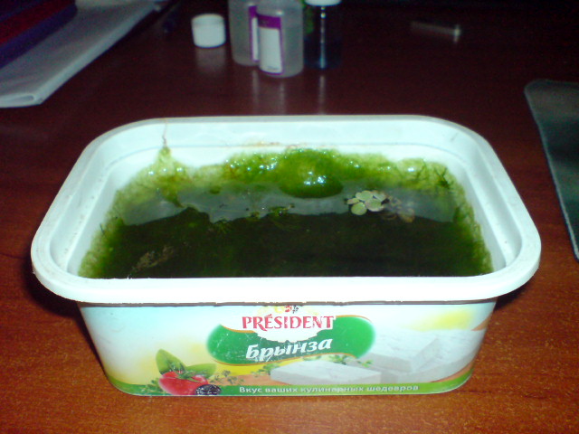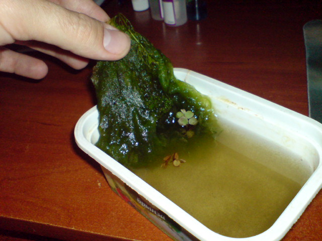 Эксперимент продолжается. Каждый день (1 пропустил) ванночки по 10-15 минут. Пока ощущаю только небольшое размягчение нитчатки. Под микроскопом часть (треть точно) нитчатки побелела. Визуально конечно этого не видно, всё такой-же комок зелёных водорослей.