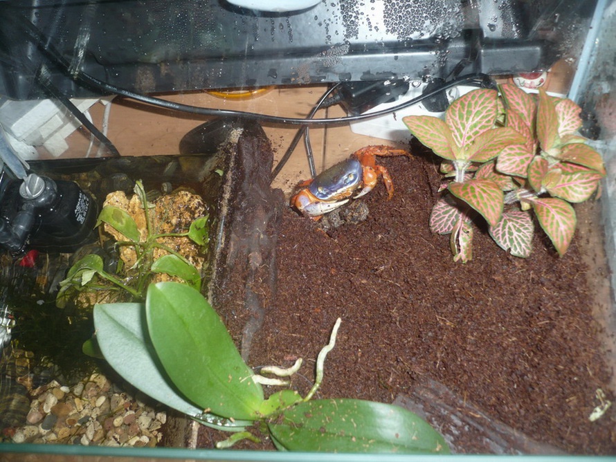 все таки поменяла дизайн. выбрала решение с плошкой (стала протекать перегородка)посмотрим как будет. только испаряется быстро. надо отслеживать, что бы краб без воды не остался