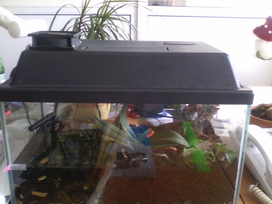 Дом-акватерра (черепашатник был на 25 литров, 42*24 см). Воды 2,5 литра (по прикидке 1/3 площади), подсоленная, фильтр с флейтой, обогревом, камни речная галька, пара песчаника. Термоковрик и будет колхозиться внешник (а то много места занимает фильтр в банке). Суша: перегородка из оргстекла, кокосовый субстрат, пара растений (мини орхидея и еще какое то) обычная лампа (но почти не зажигается), совсем на дне керамзит одним слоем. Температура гуляет от 27 до 30. сложно удержать пока.