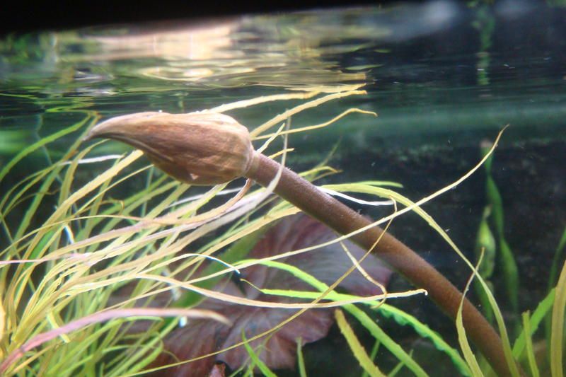 Заметила, что размер зависит от объема аквариума. У меня в 120 л у нимфеи огромные листья, стебли длинные, в 72 л листья меньше, растет она больше в ширину, а не в высоту, а вот в 35 л она вообще у меня мелкая. Вся нимфея с одного куста. Еще от освещения зависит, если ей света достаточно она будет низкорослой.