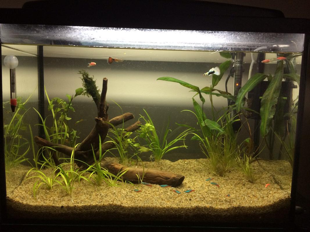 Из живности имеем: 4 коралловых данио, 8 голубых неонов, 4 анциструса, 2 гуппи. Дальнейшее "проживание" гуппи пока под вопросом (обсуждается с семьей)