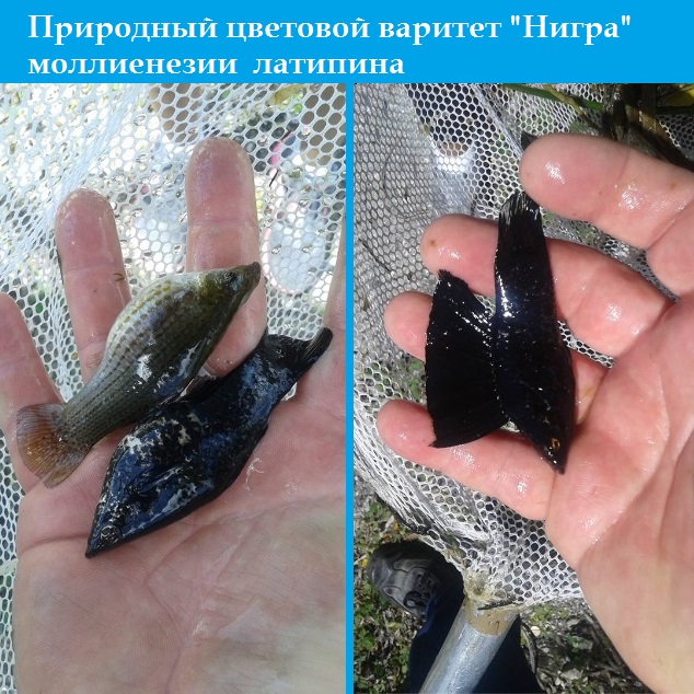 Интересная информация о Моллинезии латипина (Mollinesia latipinna) . Ниже на фото природные ареалы обитания моллиенезии латипины , во Флориде США . Фото предоставлено Adrian Hernandez ( Адриан Эрнандес) : Чего только люди не делают , на какие ухищрения не идут , для поимки редких варитетов диких Моллинезий . . . Для меня было неожиданностью сообщение Адриана , что черный варитет окраса моллиенезии латипина редко , но встречается в природе . Из совковой литературы ранее можно было узнать , что это искусственно выведенные черные варитеты "Нигра" . Эту совковую догму опровергает Адриан Эрнандес . Ниже перевод его сообщения Гуглом , Adrian Hernandez : Этот молодой черный самец и самки специально пойманные . У меня были длительные поиски этого черного варитета , пока я увидел черные пятна . Потом терпеливо ждал , пока они подплыли ближе , чтобы поймать их . У меня было много попыток , пока мне удалось поймать их . Ниже фото Адриана природной черной формы латипины : . . Еще один черно-крапчатый природный варитет моллиенезии латипины . Этого пятнистого варитета (В Украине называют Далматин) , в природе встречается больше и чаще , чем чисто черный варитет . Но все же их трудно найти . Они в основном производят зеленый варитет потомства . Ниже фото Андриана моллиенезии латипина , варитет "Далматин" . . . Далее еще две фотографии Адриана , характеризующие размеры моллиенезии латипины . . .