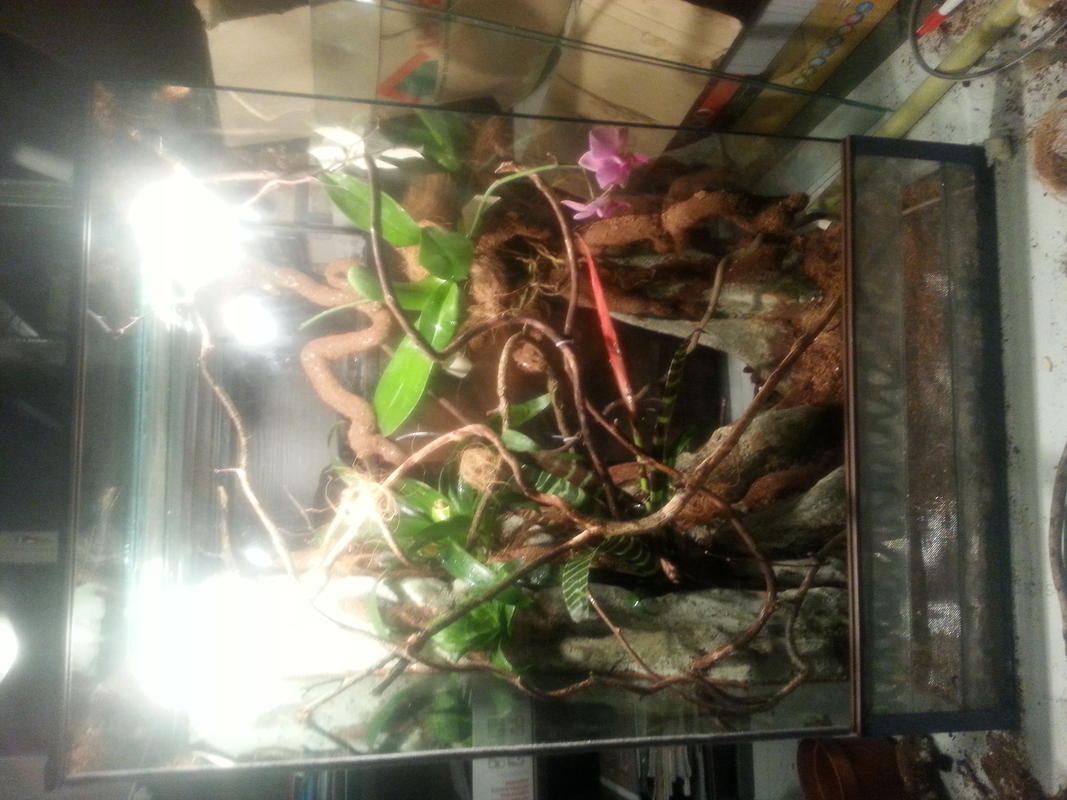 тада! вот наконец закончил, хотя теперь понимаю что остановиться сложно- все время хочется чего-то улучшить.итак, фон был признан большим для планируемого терра. я его пополам вдоль разрезал, закрепил внутри банкии пролил все швы силиконом, чтоб пища сверчко-тараканоподобная не пролезла. после посадил растючку. и закрепил лианы- самое марудное занятие ввиду подвижности оных. сегодня предстоит переезд терра к моим малым и переезд хамов в новое жилище. еще осталось оклеить фронтальные пластины внизу с вентиляцией, но это мальки сами. и установка ультрафиолетовой лампы. опять же походу работы вылез косячок- я ничем не закрыл заднюю стенку и терр не совсем комфортно просвечивает. но думаю снаружи фон с изображением леса приклеить и этим решить проблему. как по мне немного простовато, но лучше чем без него. за фото извиняюсь снимал телефоном и то не моим))