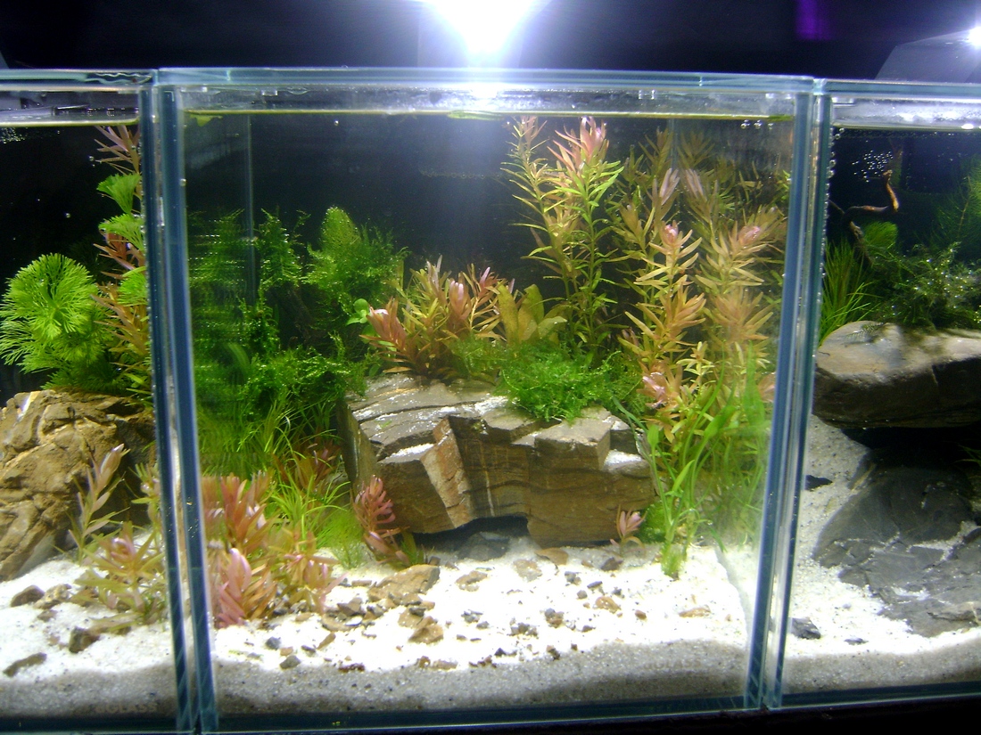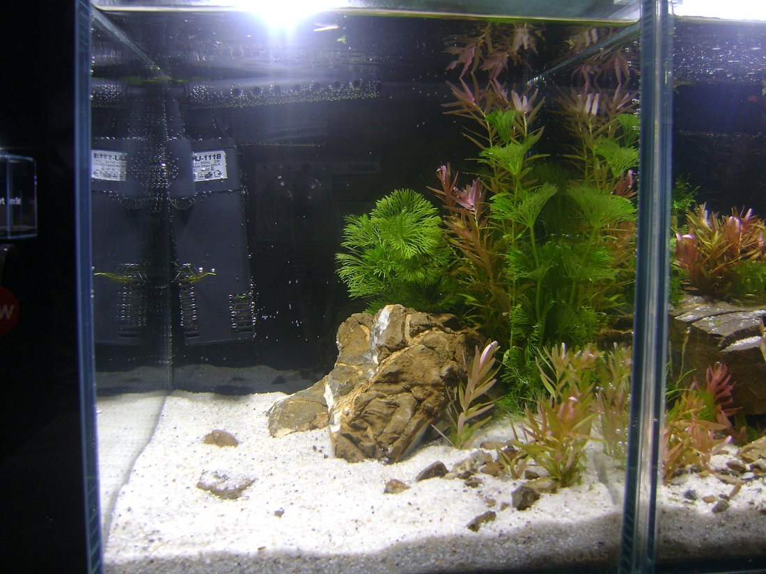 Пару слов о предоставленном нам оборудовании. Как-то до этого с десятками я не сталкивался- пятилитровые были, бОльшие тоже. Очень порадовало то что это не кубик, а, все-таки прямоугольный аквариум- у него глубина больше чем длина. Это дает аквариумисту возможность при внешней иллюзии кубика создать композицию более объемную. Респект тому, это это придумал. Светильник, естественно, знакомый. Как бы ничего нового, но очень порадовала поверхность корпуса- она намного приятнее, чем у предыдущей версии. Фильтры, которыми сейчас эта серия комплектуется, достаточно удачные- в меру компактные и конструкция выхлопа и флейты позволяет его маскировать в самых неожиданных "позах"  Ну, стекло, его обработка и качество швов традиционно нареканий не вызвали. И, да простят меня организаторы, лично меня порадовал логотип на переднем стекле- он как бы и есть, но его как бы и нет. Причем, при использовании светлого грунта, его настолько "как бы нет", что приходилось всматриваться, чтоб его найти. Не знаю, как кого, а меня раздражают броские блестящие лейблы других брендов, висящие на самых видных местах.