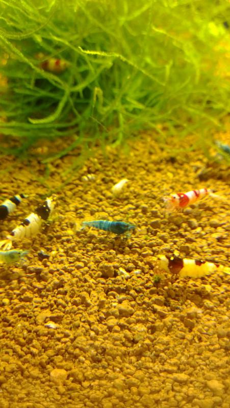 Аквариум около 240 литров, воды - около 220-ти; фильтр fluval 405; грунт Ада Амазония Нью, высота от 3-х до 7-ми см (включая Аду пудру, слой которой около 2-х см). Вода: осмос, реминерализованный CaCl2 и MgSo4 (соотношение 5:1); нитрат и фосфат нулевые, Ph=5.2-5.5, Gh=5-6, Kh=0-1, t=23-24. Население - около 150-ти половозрелых кристаллов (кк, чк и золотых, класс от А до SS плюс "бесклассовые" (извините, просто не знаю даже, как их правильно назвать - я имела ввиду креветок, которые к примеру по рисунку соответствуют SS, но качество окраса никуда не годится)). Ну, и малька до 1 см много, думаю, сотни три точно.
