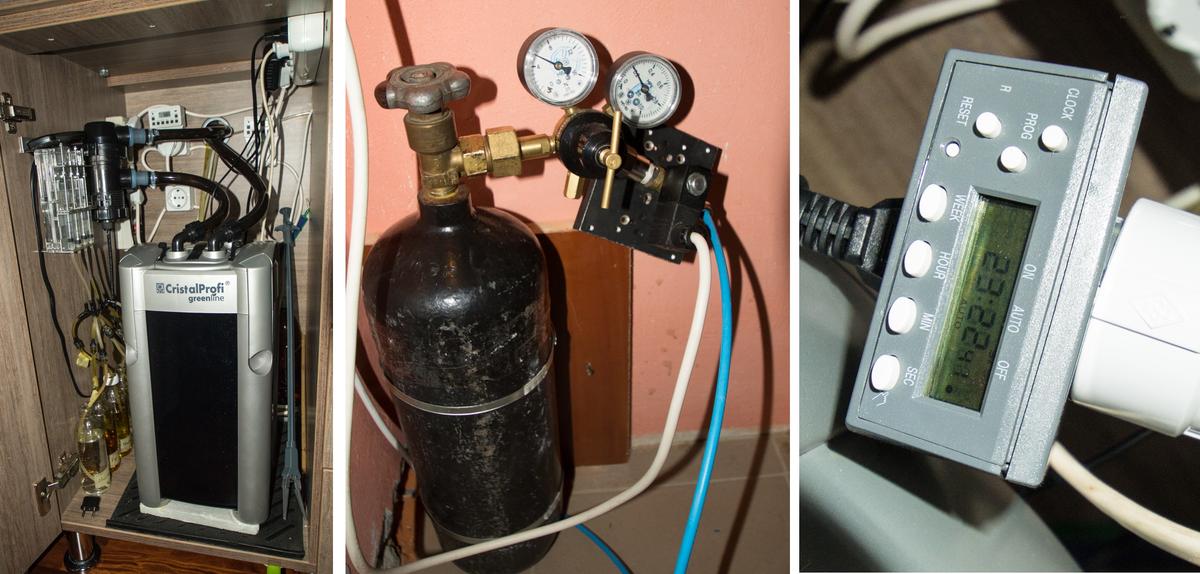5л СО2 балон з арматурою Camozzi. CО2 подається з 7:00 до 21:00, насиченість СО2 у воді контролюється дропчекером, інтенсивність подачі - лічильником бульбашок. Розпилення СО2 через 4 гілочки бузини під'єднані через розгалужувач (на фото).