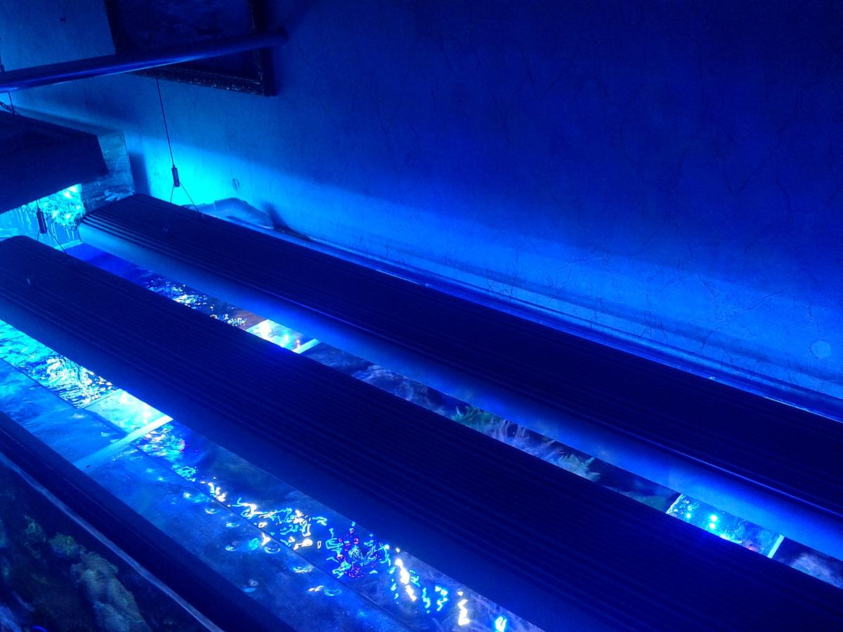 Сегодня вторые сутки как аквариум под новым освещением. Конечно ,это что то, и словами не передать всё горит, всё светится, аквариум ожил красками. Да и жары меньше стало в комнате, а то от ламп Т 5 в аквариуме была тем +26,27а то и 28, да и в комнате пекло, теперь не выше +25 в аквариуме и в комнате намного прохладней , меньше кондишин гонять стал. Пытался сфотать, а не может среднего качества фотик передать всю красоту рифа , так что пока только на обзор 2 фотки выложу т , а со временем наделаю фоток зеркалкой и выкладу на обзор. В процессе сборки были лёгкие проблемы с креплением пришлось переиграть где и как крепить, произошли изменения по распределению диодов во время пайки, стало так,