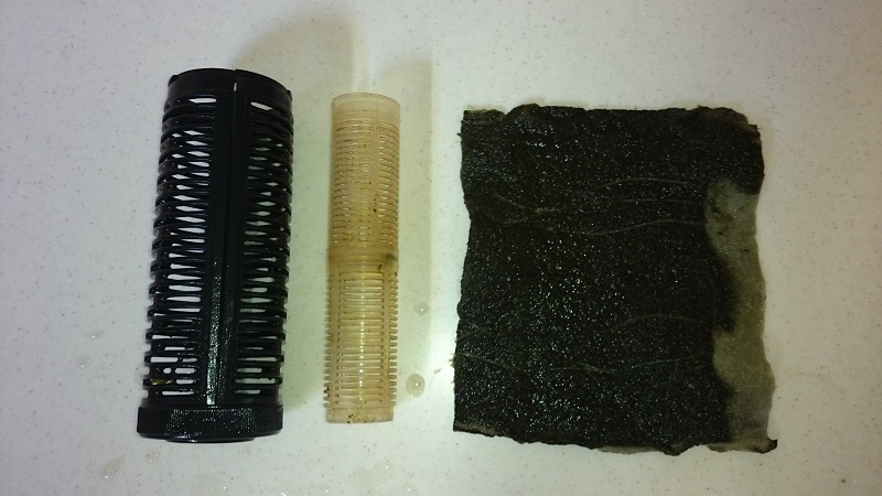 Не утерпел-таки, попробовал на скорую руку. В магазине был приобретен кусок агроволокна 17 г/м2 размером 1,6х1 м2. Из него нарезал ленты шириной, равной высоте стакана фильтра и условно-плотно скручивал в цилиндрик, пока не набрал примерно 3 см в диаметре. Ушло 4 полоски по 1,6 м. Вставил получившееся в стакан и придавил верхней частью. Честно скажу - из картинки внизу видно, что фильтр я выбрал не самый удачный и вода вполне могла огибать всю конструкцию, но что сделано, то сделано. Погонял фильтр в ведёрке полчаса, чтобы смыть магазинную пыль с материала, и поставил на ночь в аквариум. Последнее фото - вкладыш из агроволокна после 7 часов работы. Что-то он отфильтровал! Будем совершенствоваться дальше